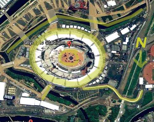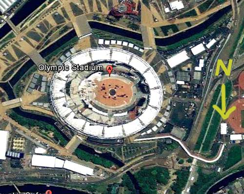 Images 10 and 11 - Olympic Stadium from Google Earth. The Eye of Horus can be seen when including the structure and the surrounding landscape. The Wedjat is highlighted in the second image. ----------------------------------------------------------------------------------------------------------------
